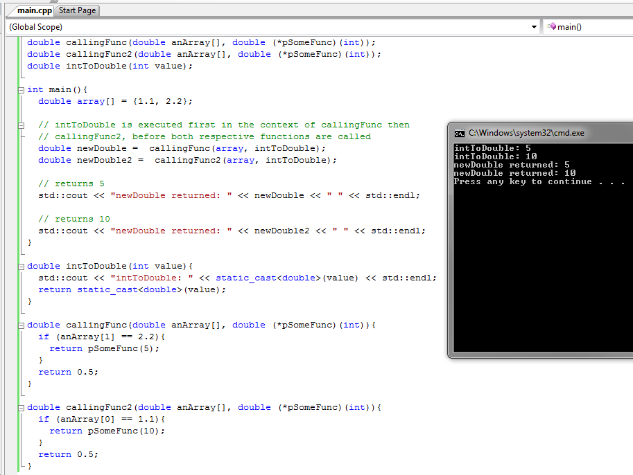 Note that pSomeFunc is assigned to intToDouble without params so that it is called within the calling function, i.e. not