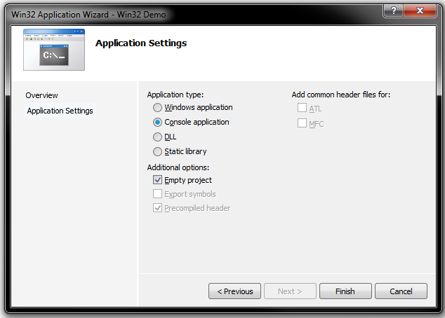 Start a new project as a Win32 project: